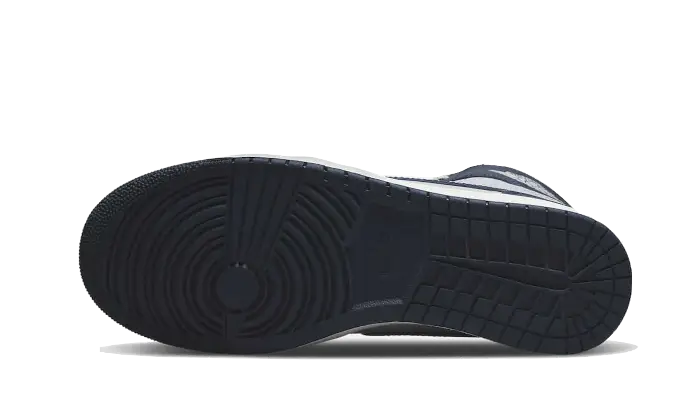 La tomaia delle Jordan 1 ’85 Georgetown è realizzata in pelle premium, con una combinazione di grigio scuro e blu navy che caratterizzano la maggior parte della scarpa, mentre l’iconico Swoosh laterale e il logo Wings sono realizzati in un elegante argento metallizzato, che aggiunge un tocco di contrasto. La linguetta, anch’essa grigia, presenta il branding Nike Air, un richiamo all’originale silhouette delle Jordan 1.