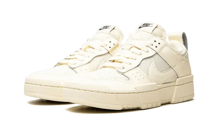 La tomaia è realizzata in pelle e materiali premium, con una base in “Coconut Milk”, una tonalità calda e morbida che dona alla scarpa un aspetto sofisticato e facilmente abbinabile. I pannelli sovrapposti, le cuciture visibili e la suola rialzata caratterizzano il design Disrupt, aggiungendo un tocco di innovazione e dinamismo alla silhouette classica delle Dunk. Dettagli in bianco e beige completano il look, conferendo un contrasto delicato ma elegante.