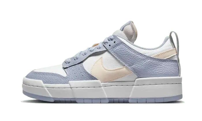 La tomaia è realizzata in pelle premium bianca, con dettagli in “Ghost”, una tonalità chiara che dona un effetto sfumato e delicato al modello. I pannelli sovrapposti e le cuciture visibili tipiche del design Disrupt aggiungono profondità e dinamismo alla scarpa, mantenendo al contempo una silhouette pulita e sofisticata. Il Swoosh laterale, in pelle bianca, si fonde armoniosamente con la tomaia, completando il look minimalista ma distintivo.