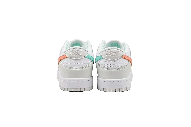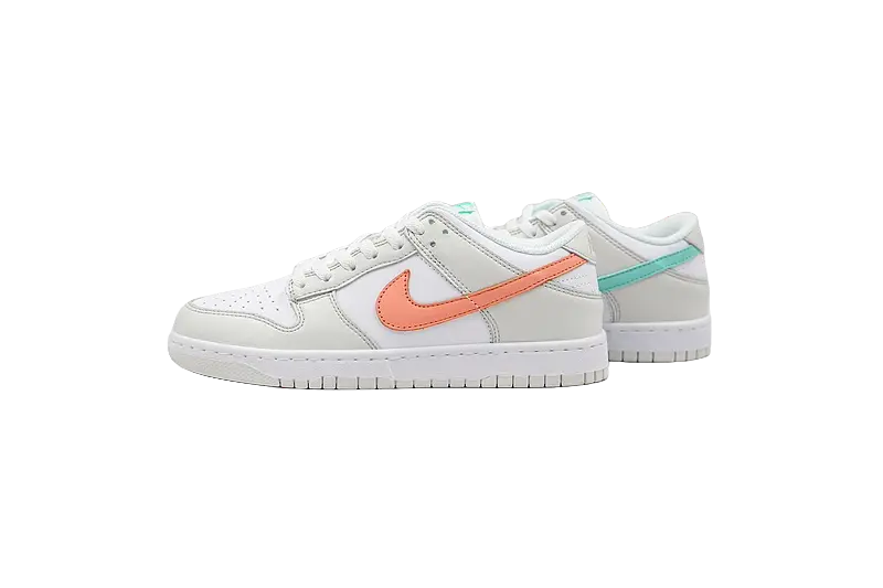 La tomaia è realizzata in pelle premium e tessuti resistenti, con una base bianca che fornisce un tela neutra e pulita per esaltare i colori vivaci delle sovrapposizioni. Le tonalità tropicali di verde, giallo, arancione e blu si mescolano in modo armonioso, portando un tocco esotico e fresco alla scarpa. La vera caratteristica distintiva di questa Dunk è il design “mismatch” dei Swoosh, con un Swoosh verde su un lato e un Swoosh arancione sull’altro, creando un contrasto visivo interessante e divertente che richiama il concetto di diversità e originalità.